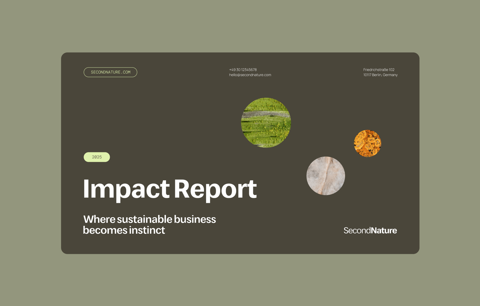 The colour palette combines earthy and high-contrast tones to reflect the dual nature of the consultancy. Brown and olive green ground the brand in longevity and environmental thinking, while lime green and peach introduce energy, optimism and a subtle tech-forward edge. Together, they position SecondNature at the intersection of sustainability and modern, scalable business strategy.