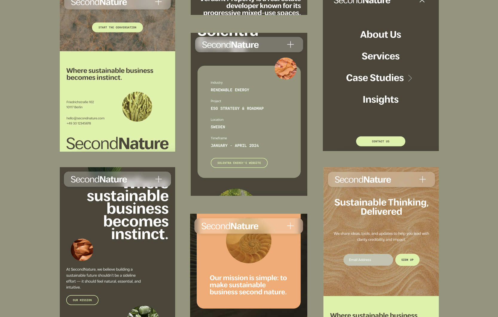 SecondNature was conceived as a new sustainability consultancy entering a crowded and often visually generic market. The challenge was to create a brand and website that felt credible and knowledgeable without appearing overly institutional, while appealing to startups and younger decision-makers. At the same time, the identity needed to clearly differentiate itself from traditional “green” sustainability branding, communicating long-term thinking and systems-level impact in a contemporary, digitally fluent way.