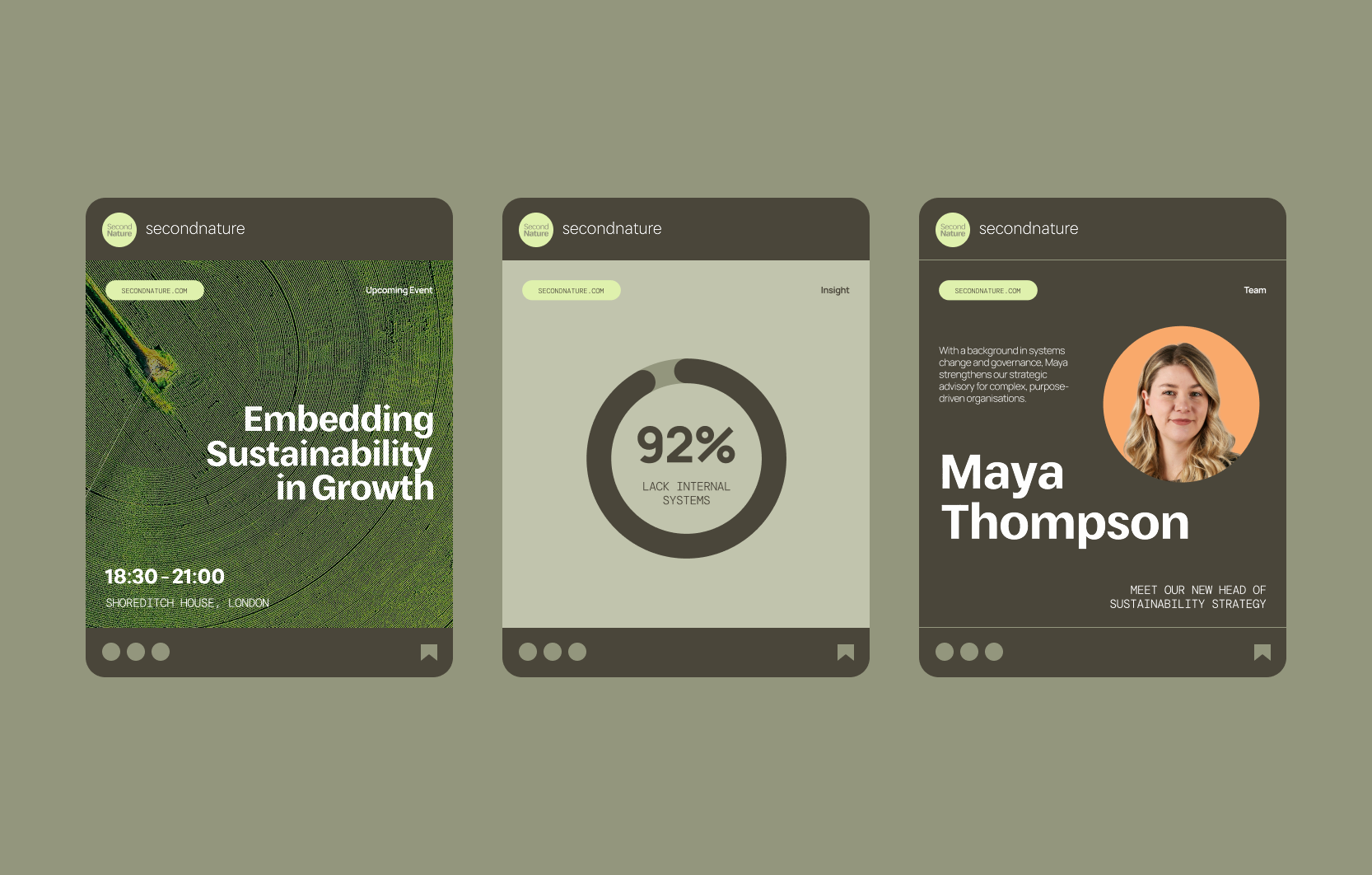 The concept for SecondNature was built around the idea of integration - positioning sustainability as something embedded into how organisations operate and evolve. Rather than relying on purely natural or ethical cues, the brand frames sustainability at the intersection of technology, strategy and modern business thinking. This informed a grounded visual direction paired with a clear, editorial-style website that makes the consultancy’s philosophy feel accessible.