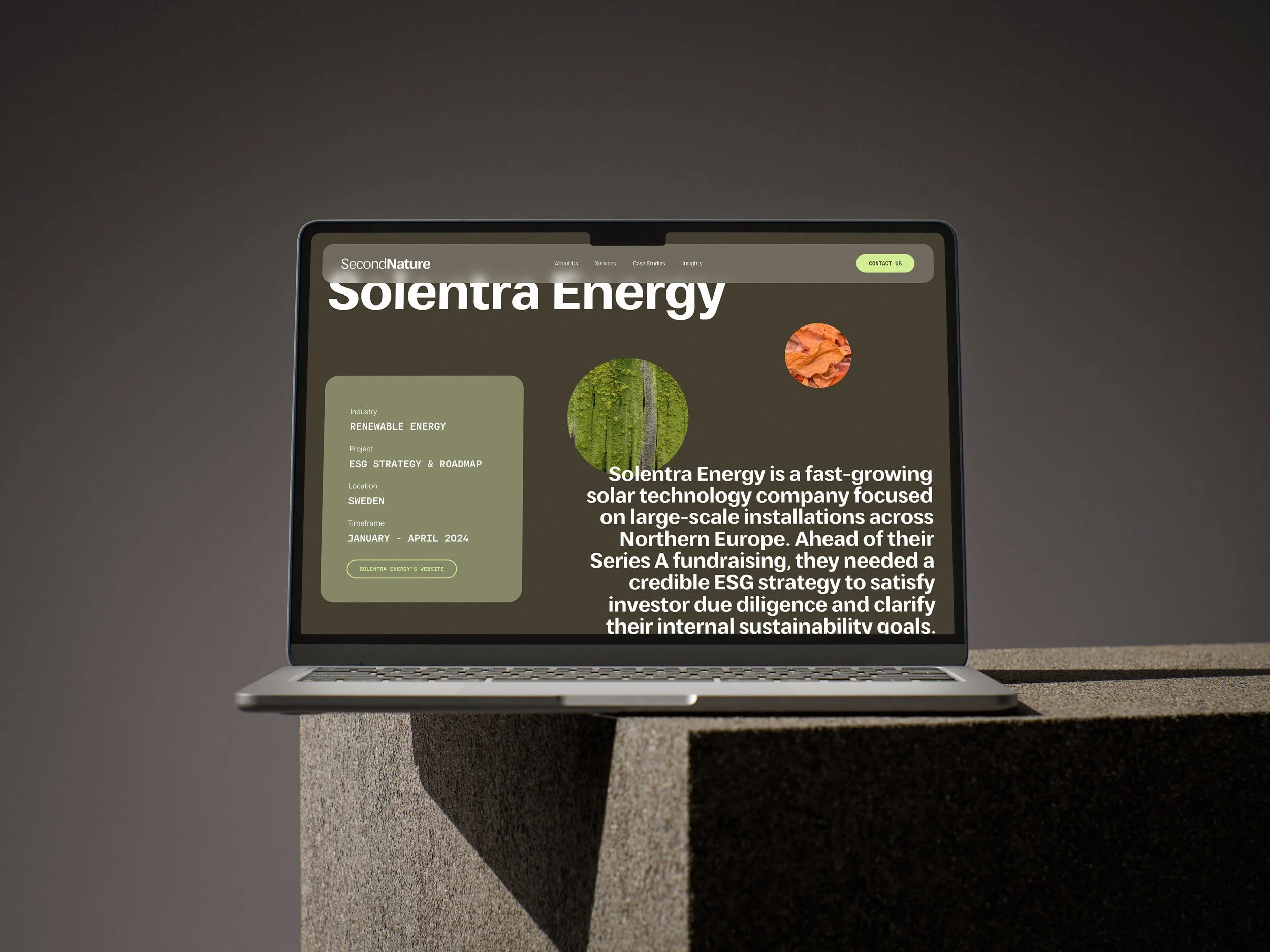 Imagery focuses on close-up details of natural elements, treated more as textures than literal representations of landscapes or ecosystems. This avoids common sustainability clichés and creates a tactile, considered visual language that reinforces the idea of closely examining systems, materials and processes. All imagery sits within the same tonal range as the palette, creating a cohesive experience across the site.